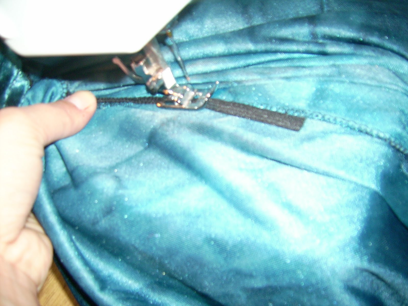 Jeśli chcemy uzyskać marszczenia po bokach - na dole szwu bocznego sukienki przypinamy szpilką wąską gumkę dł. ok. 10 cm.